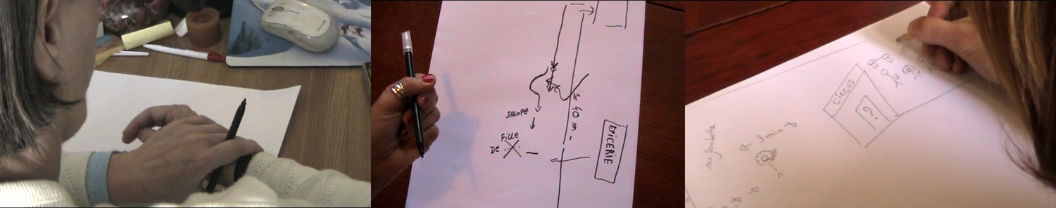 L’enquête nous a permis de constater une distinction entre ce qu’entendent dans la rue les personnes perçues comme femmes, et la façon dont chacune les vit, les gère. Pour rendre visibles les différences de perceptions, nous nous sommes également inspiré·e·s du travail artistique de Till Roeskens [7], et avons filmé la réalisation de cartes mentales répondant à la question « Peux-tu nous raconter et nous dessiner ta dernière sortie la nuit ? ». En fond sonore, la voix de la personne qui décrit son trajet permet de mieux saisir ce qu’elle ressent, ce qu’elle pense, ce qu’elle vit. Ces cartes montrent autant de façons de vivre l’espace public, la nuit, la fête, et autant de façons de faire avec et contre les discours et les violences qui balisent les sorties nocturnes des personnes perçues comme femmes.