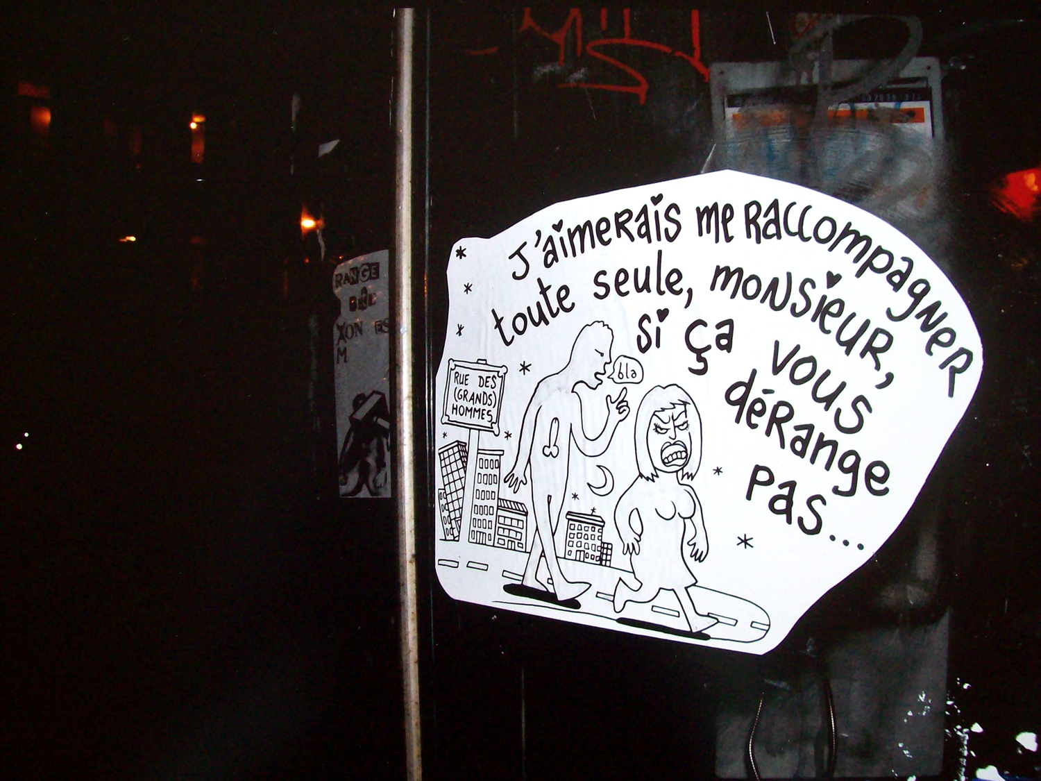 Le contexte dans lequel a été montée l’exposition se caractérise par une visibilisation et une prise en charge croissantes par les pouvoirs publics de la question des violences contre les femmes dans les espaces publics. Cette institutionnalisation (relative) du problème entraîne une certaine définition des enjeux, des victimes, des coupables et des solutions, dans laquelle nous ne nous reconnaissons pas.