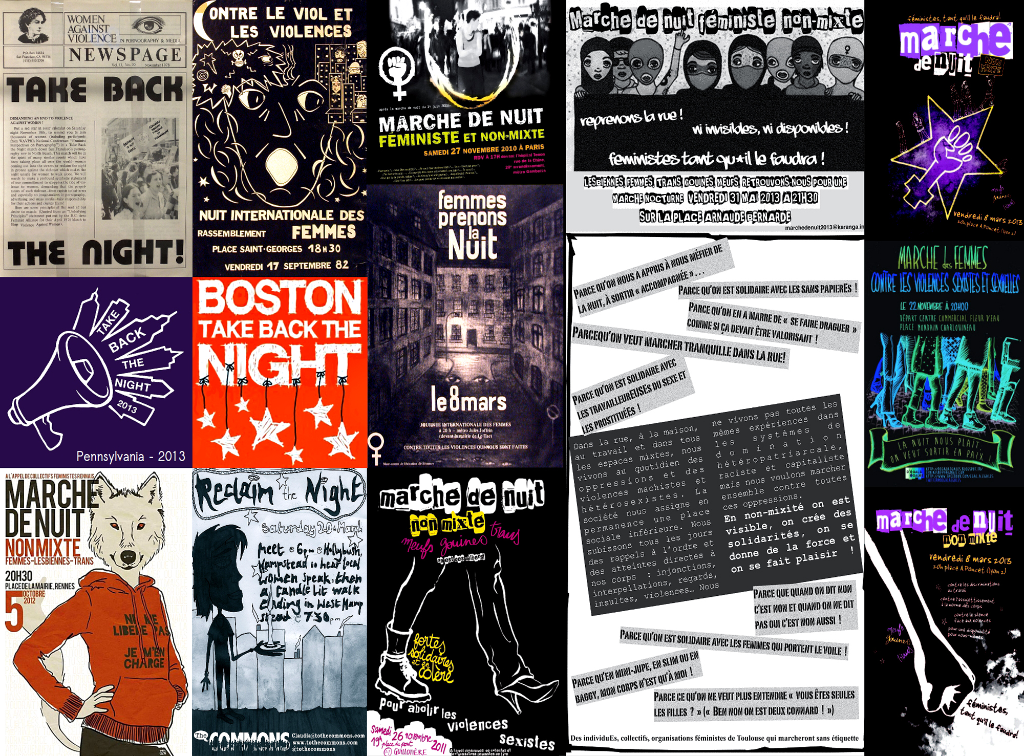 L’histoire des marches de nuit reste encore à écrire, mais on sait que les années 1970 ont vu leur multiplication en Belgique, en Italie, en Allemagne, en Australie, en Inde et au Canada (Coderre et Coderre 2017). En France, c’est en septembre 1982 que des femmes se rassemblent pour la première fois la nuit pour marcher « contre le viol et les violences ». Si ces marches de nuit ont pris des formes variées, en fonction des pays, des mouvements de lutte et des manières diverses dont les violences faites aux femmes y ont été analysées, toutes ont en commun la revendication portée par ce slogan : « Take back the night ! », c’est-à-dire que la sécurité des femmes soit assurée partout, sans que cela implique une réduction de leurs libertés.