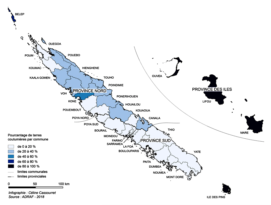 La colonisation (1853-1946), en imposant la propriété privée individuelle, a rompu l’équilibre territorial préexistant dans lequel les usages des terres étaient répartis entre familles selon la coutume (Dauphiné 1987). C’est pourquoi, dès les années 1950, les indépendantistes kanak ont réclamé la reconnaissance du fonctionnement coutumier de la terre. La période de tensions politiques et ethniques intense entre 1984 et 1988 a conduit à l’accord de Nouméa qui reconnaît que « l’identité de chaque Kanak se définit d’abord en référence à une terre ». L’organisation clanique est encadrée d’instances coutumières qui répartissent les droits d’administrations et d’usages en s’appuyant sur des principes relevant du sacré, du non-marchand, de l’oralité, du consensus et de la transmission. La gestion du territoire maintient la cohésion sociale (Pantz 2017).