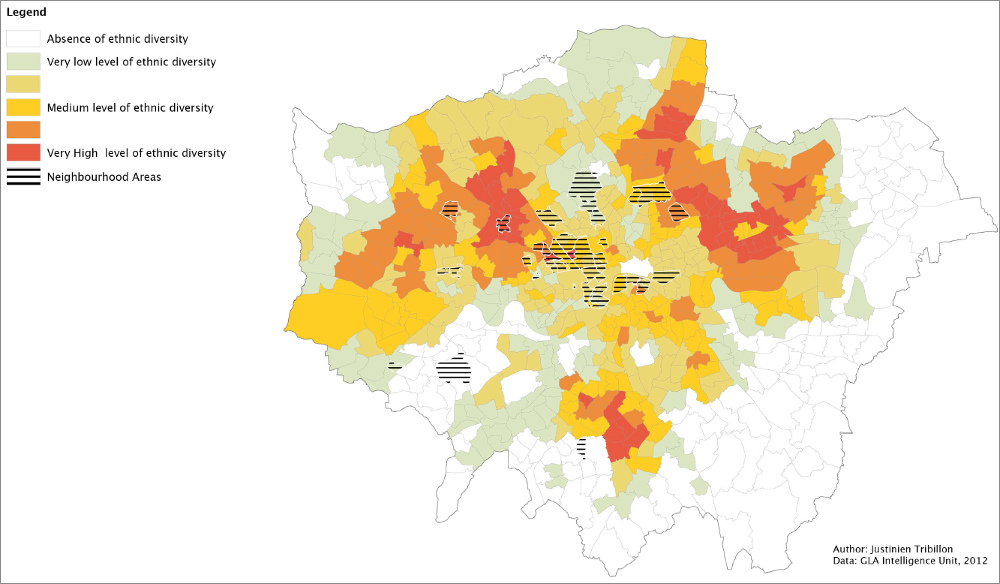 Figure 2 reveals a weak correlation between the level of ethnic diversity and the location of Neighbourhood Areas. Although it appears that they tend to be located in the least ethnically diverse wards, a significant number of these Neighbourhood Areas have also been created within zones displaying a medium to very high level of ethnic diversity. This indicates that Neighbourhood Areas are only weakly correlated to the level of ethnic diversity.