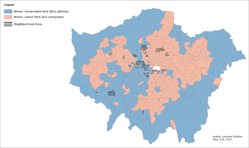Three indexes have been used to map London’s diversity and compare it to existing Neighbourhood Areas: ethnic diversity by ward, socio-economic diversity by Lower Super Output Area, and the winner by ward of the 2010 mayoral elections.