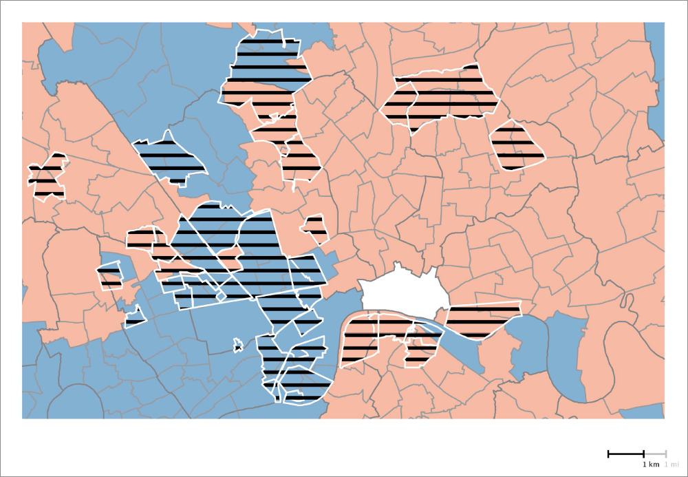 Figure 4 reveals a strong correlation between the political choices made by electors and the boundaries of the Neighbourhood Areas. The correlation concerns not the choice of party per se, but rather the level of political homogeneity within each of the Neighbourhood Areas. Only four applications are composed of a majority of Conservative-voting wards or a majority of Labour-voting wards. For instance, the Neighbourhood Areas within the borough of Westminster (in central London)stand out by their clear demarcation in terms of electoral results (see Figure 5, which zooms in on Neighbourhood Areas within Westminster).