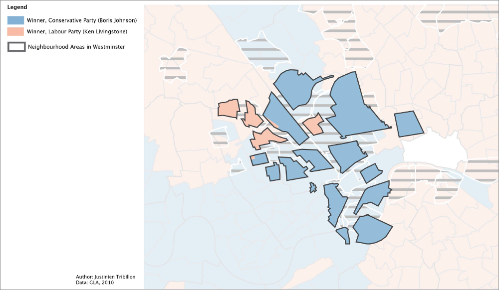 The third index is the winner, by ward, of the 2010 London mayoral elections, which in most cases was a two-way contest between the candidates from the Labour Party (Ken Livingstone) and the Conservative Party (Boris Johnson).