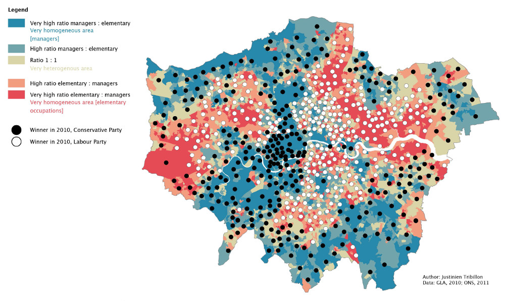 Three findings can be drawn from these maps. First, there is only a weak correlation between ethnic diversity and Neighbourhood Areas. However, looking at diversity from a socio-economic point of view reveals the great homogeneity of “neighbourhoods” applying to be designated as Neighbourhood Areas. Also, the strong correlation between socio-professional categories and their political choices (figure 6) – i.e. “managerial occupations” tend to vote for the Conservatives, and “elementary occupations” for Labour – confirms the homogeneity of the areas mobilising to set up a Neighbourhood Area. Finally, the most well-off neighbourhoods are more likely to set up a Neighbourhood Area.
