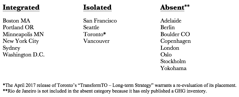 The final pattern that emerged was temporal. In looking at each city’s archives it became clear that over time, cities were incorporating principles of justice into the plans. This observation is consistent with Schrock, Basset, and Green’s finding that updated climate plans have higher equity ratings (2015, p. 287). They explain, “The factor that appears to be most clearly associated with an equity orientation is whether the plan was the city’s first effort or not” (ibid.). They suggest that “deepening of local sustainability capacity,” relating to interest groups’ ability to shape the agenda, could account for this trend (ibid.). However, interest groups could shape a city in many ways, and the authors do not explain why the interest group involvement results in the incorporation of equity. The transition from isolated to integrated is happening in both New York City and Toronto for difference reasons. New York City’s jump between categories clearly aligns with a change in mayoral leadership. Although this constitutes an incorporation of the principles of justice over time, in New York City this trend could easily be reversed with the election of a new mayor. In Toronto, however, with the release of TransformTO, the shift from isolated to integrated is harder to trace. Language in the TransformTO report suggests that network effects contributed to the shift, which could be explored in future research.