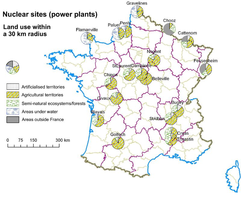 - predominantly agricultural sites (where over 60% of the territory is dedicated to farming): Golfech, Civaux, Nogent, Belleville and Chinon; Penly, Paluel and Flamanville, excluding maritime zones; and Dampierre and Saint-Laurent, where a more appropriate term would be “agroforestry” sites;