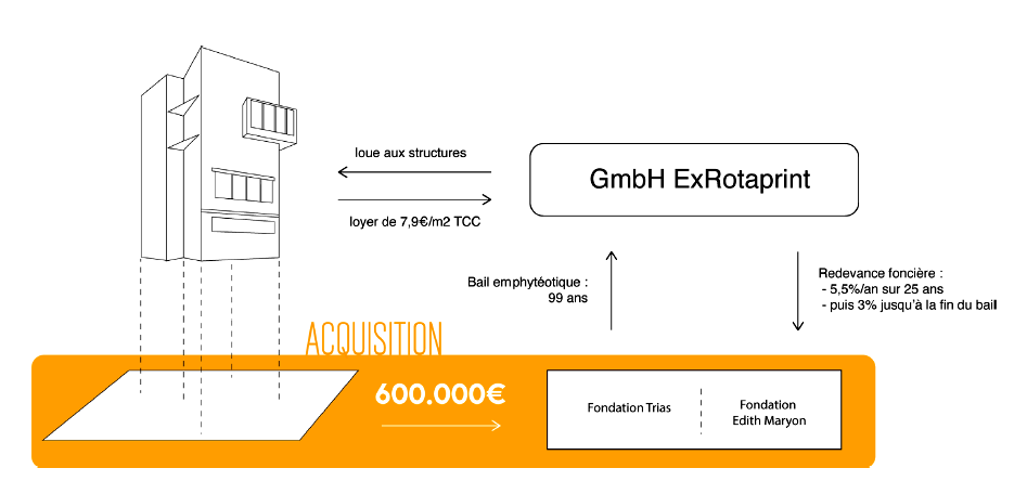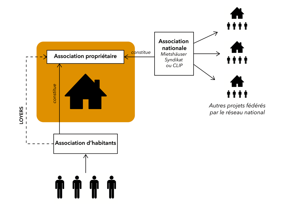 Le premier montage juridique et économique identifié s’inscrit dans une perspective de long terme et entend découpler la valeur marchande des sites sur lesquels les activités sont implantées et les loyers que payent les occupants. Il a été pensé par le réseau allemand du Mietshäuser Syndikat et plusieurs structures s’en sont inspirées à l’étranger, comme le Comité de libération de l’immobilier privé (CLIP) en France.