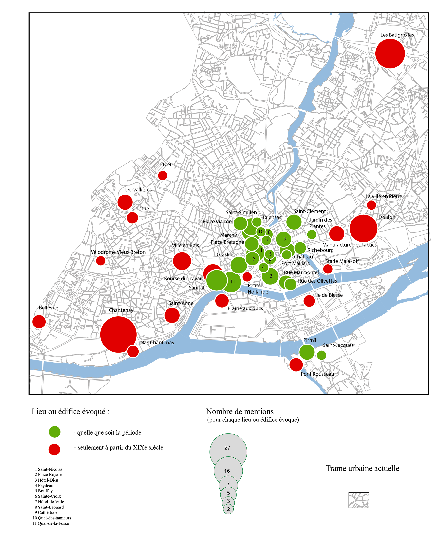Un comptage des occurrences des toponymes permet de proposer une cartographie (figure 1) des lieux et des édifices qui participent de cette histoire populaire. Pour la période précédant le XIXe siècle, le Sanitat [5] – dédié aux contagieux – et l’Hôtel Dieu qui accueille les indigents sont ainsi les lieux les plus cités dans l’ouvrage. A contrario, il n’est question du château des Ducs de Bretagne qu’à cinq reprises. Cette histoire populaire fait ainsi émerger de nouveaux lieux, différents de ceux qui sont aujourd’hui les plus connus, en proposant de les inclure dans le patrimoine local. Une nouvelle géographie patrimoniale se dessine.