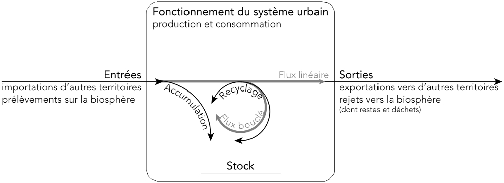 Les origines de la crise des déchets ont déjà été attribuées à la fatalité ou au résultat d’une défaillance de l’action publique face aux impératifs de la Camorra (Giuliani 2009). En la resituant dans le temps long de l’histoire urbaine, l’auteur expose ses fondements socio-écologiques. L’ouvrage étudie la production et la gestion des déchets à Naples entre 1884 et 2004 à partir de la notion de métabolisme urbain, qui permet d’examiner les relations entre le site urbain, la société et son environnement matériel. L’analyse des flux de matières qui entrent et sortent de la ville définit ce métabolisme. Naples, comme tout autre site urbain, est doté d’un stock matériel initial insuffisant pour la pérennité de l’établissement humain. Pour pallier cela, ce territoire prélève et importe des matières de la biosphère ou d’autres territoires, de même qu’il rejette et exporte ces matières (ou d’autres) vers des espaces tiers (Barles 2007). En résulte donc un fonctionnement par cycles plus ou moins bouclés, selon que les flux entrants sont recyclés à l’intérieur du système urbain ou, au contraire, exportés (voir figure 1).