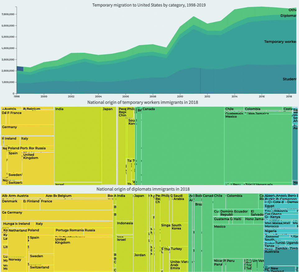 Among the useful visualizations are interactive graphs on migration patterns, which simultaneously show the national origin of new migrants to the New York region, while also indicating whether people moved as students, temporary workers, diplomats, or others. This, for example, allows us to see that in 2018, while most temporary workers to New York came from Asia and the Americas, particularly India, Canada, and Mexico, most diplomatic migrants came from Europe.