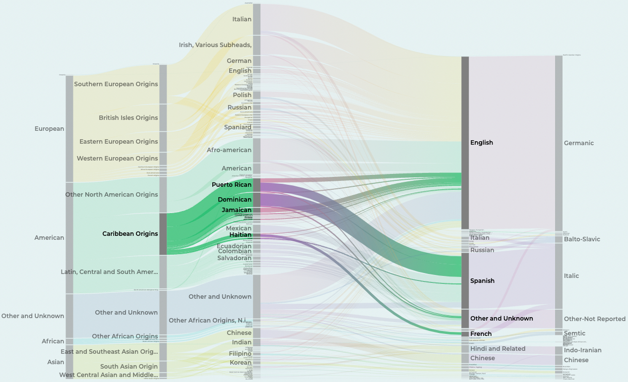 The tool also documents language diversity by showing the connections between the mother tongue of the population of New York immigrants with their country of origin, demonstrated with a Sankey diagram. This is particularly useful in a city that is trying to expand its multilingual accessibility tools.