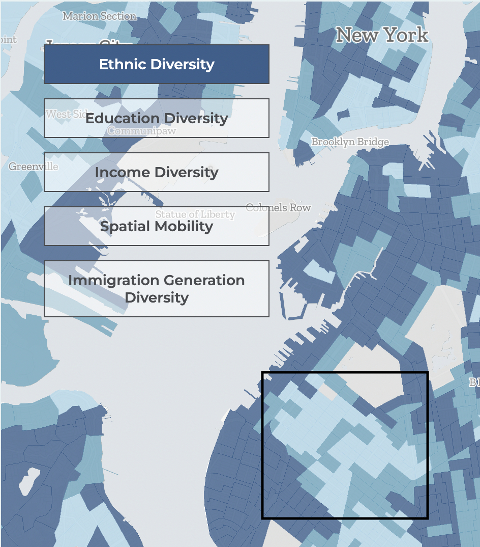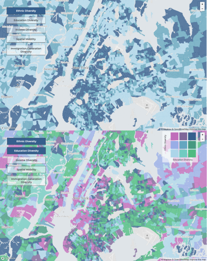 One of the team’s main creations is the ability to map dimensions of “diversity” interactively, visualizing them in combination with one another. These “superdiversity maps” go beyond “traditional maps” (which show only one distribution at a time, such as percent high income, percent immigrant, percent white, etc.) in two ways. First, they provide measures of “diversity,” which statistically synthesize the total composition of a neighborhood with respect to ethnicity, education, income, mobility, and immigration status. Secondly, they allow the user to pick two diversity measures simultaneously. One can thus see, for example, the areas of the New York metro area that have high ethnic diversity but low income diversity.