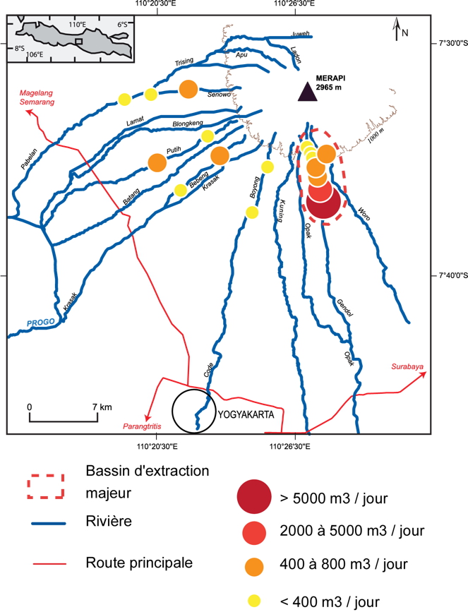 L’activité extractive n’est pas récente : les prang hindouistes de Prambanan au sud du volcan et le vaste stupa bouddhiste de Borobudur à l’ouest ont été bâtis aux VIIIe et IXe siècles à partir de blocs de lave (figure 4a) récupérés dans les vallées (figure 4b). Depuis des siècles, les carrières ont fait partie du quotidien des habitants du volcan, et représentent une ressource qui leur a permis de vivre avec les crises volcaniques.