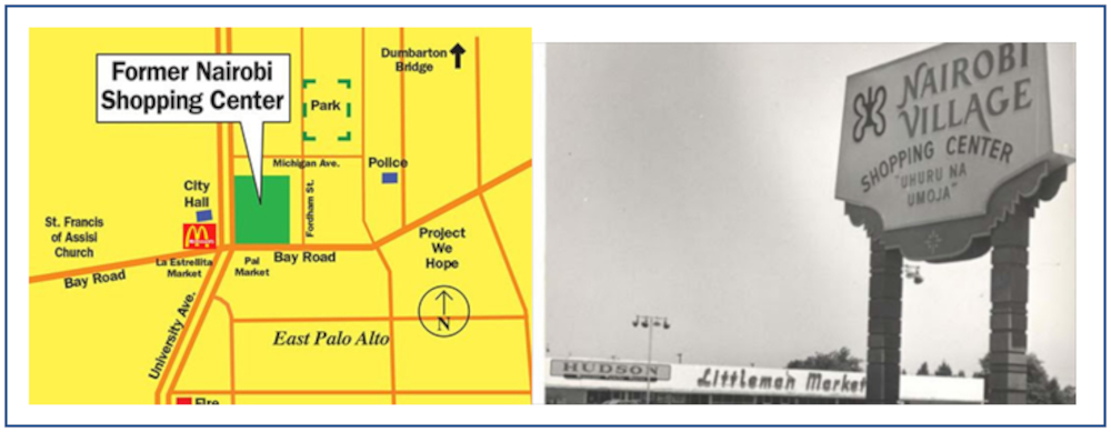 In 1968, Black youth spearheaded a vote to change East Palo Alto’s name to Nairobi, as a way to transcend EPA’s postwar history of segregation and inequality (Caldwell 1968). The Nairobi movement aimed to develop a new Black Power spatial imaginary reflecting EPA’s role as a node in the Bay Area’s Black Power landscape (Black Panther Party 1972; Rickford 2016). Nairobi Shopping Center, along with an Afrocentric day school and junior college, was one of the community’s most visible symbols of EPA’s Nairobi era (Davies 1969).