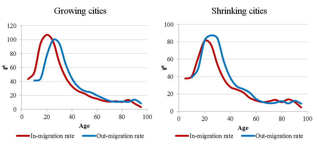 With regard to the age variable, out‑migration and in‑migration rates are highest for individuals aged 20 to 30. It is between these ages that the probability of residential mobility is the greatest, in growing and shrinking cities alike. However, there is a slight offset between the two rates: while mass in‑migration flows occur in urban areas around the age of 20, owing to residential mobility linked to higher education or employment strategies, the highest out‑migration rates are observed around age 30, as families (and thus households) grow, requires adjustments to housing conditions (Baccaïni 1994). While in growing cities in‑migration rates of young adults (aged 20–25) heavily exceed out‑migration rates and make up for the departures of 30-year-olds, out‑migration rates in shrinking cities are constantly higher than in‑migration rates, even at age 20. Inhabitants who leave shrinking cities are mostly aged 20 to 40, creating population deficits for this age group that contributes to the faster ageing process observed in these cities.