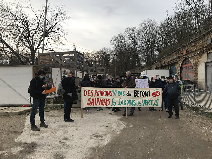 Winter 2021 in Aubervilliers, in the northern inner suburbs of Paris. Behind a building site, between gardens and a few old buildings, a group of gardeners and residents with placards chant slogans such as: “Rangez vos engins, laissez-nous les jardins !” (“Take away your machines, give us back our gardens!”; and “Des potirons, pas du béton !” (“Squash, not cement!”). On this winter’s day, developer Grand Paris Aménagement came to present a project for a training pool for the Paris 2024 Olympic Games, which would require the destruction of several plots of community gardens (allotments) known as the Jardins Ouvriers des Vertus, created in 1935 at the initiative of a local association. Faced with the influx of demonstrators—and following their intrusion into the room booked for the occasion—the meeting was postponed.