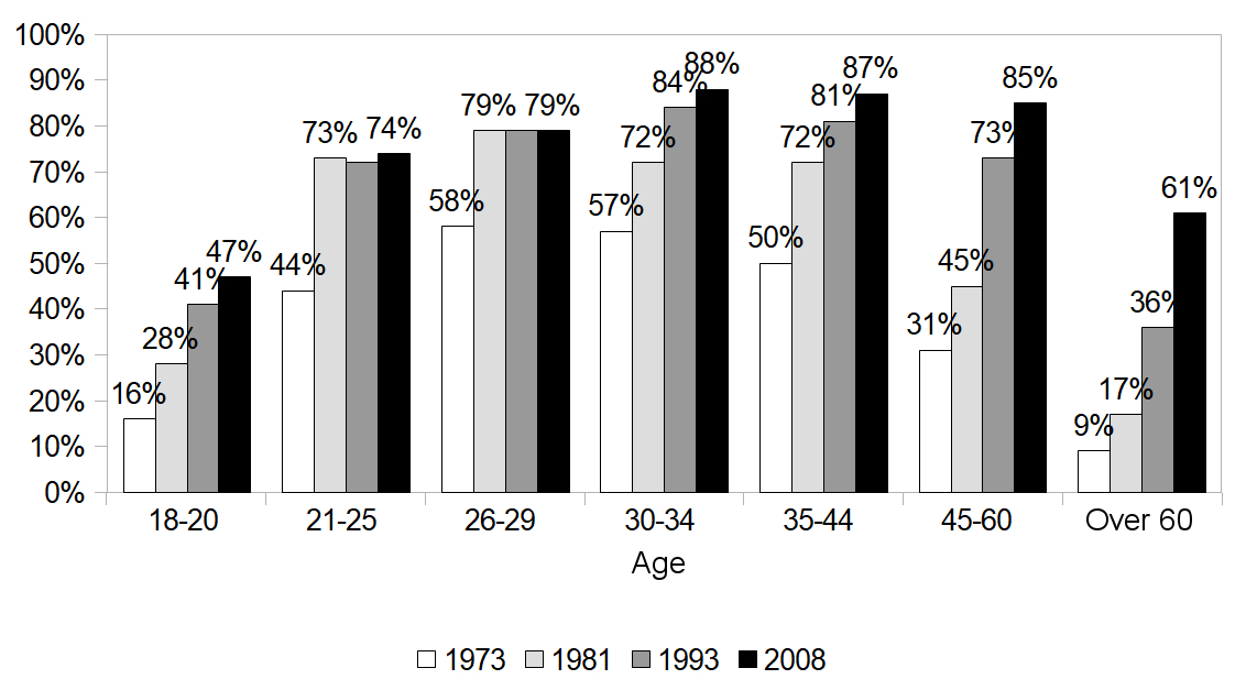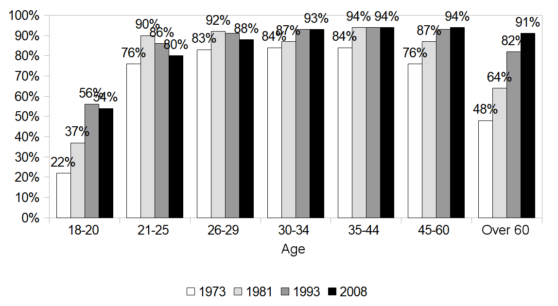 The rate of driver’s license ownership has increased very strongly among the youngest: while 18-20 year olds were 19% to hold pink paper in 1973, they were exactly 50% in 2008. During this period, we are therefore not witnessing a disaffection with the driver’s license, but on the contrary its massive diffusion among the youngest. The 1970s, during which the young cohorts of the baby boom massively drive (Demoli 2015a), saw a particularly high rise in the detention rate for this age group, while the other decades show a smaller growth trend.