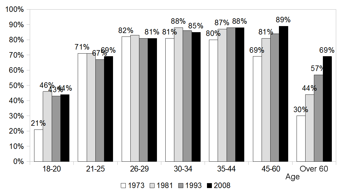 Interpretation: in 1973, 21 out of every 100 households whose reference person was aged between 18 and 20 had at least one car.