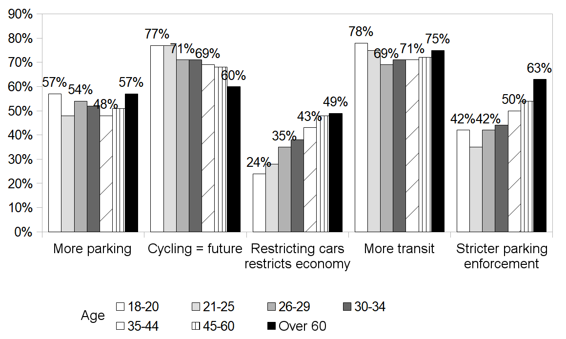 Interpretation: 57 out of 100 individuals aged 18 to 20 agreed with the statement "We need to keep building parking lots."