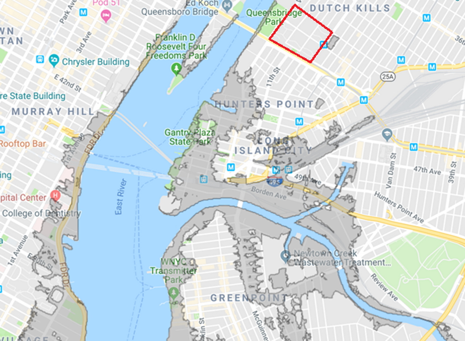 The shoreline of Long Island City is a hardened sheltered bay plain, which includes low elevation with gradual slopes with reinforced shorelines of fine sediment. This shore type faces acute vulnerability to storm surge, as well as long-term vulnerability to sea-level rise (NYC Department of City Planning 2013). Newtown Creek and the East River provided the source for floodwaters into Long Island City, with waters from the East River mostly coming in via Anable Basin (the planned location of Amazon’s HQ2 (Kensinger 2018)). Up to six feet (1.8 m) of flooding occurred along 2nd Street, 5th Street, 51st Avenue, and Borden Avenue, causing damage to numerous buildings, though overall much of the neighborhood was not affected by floodwater (PlaNYCa 2013). Figure 1 illustrates the full extent of flooding inundation into Long Island City.