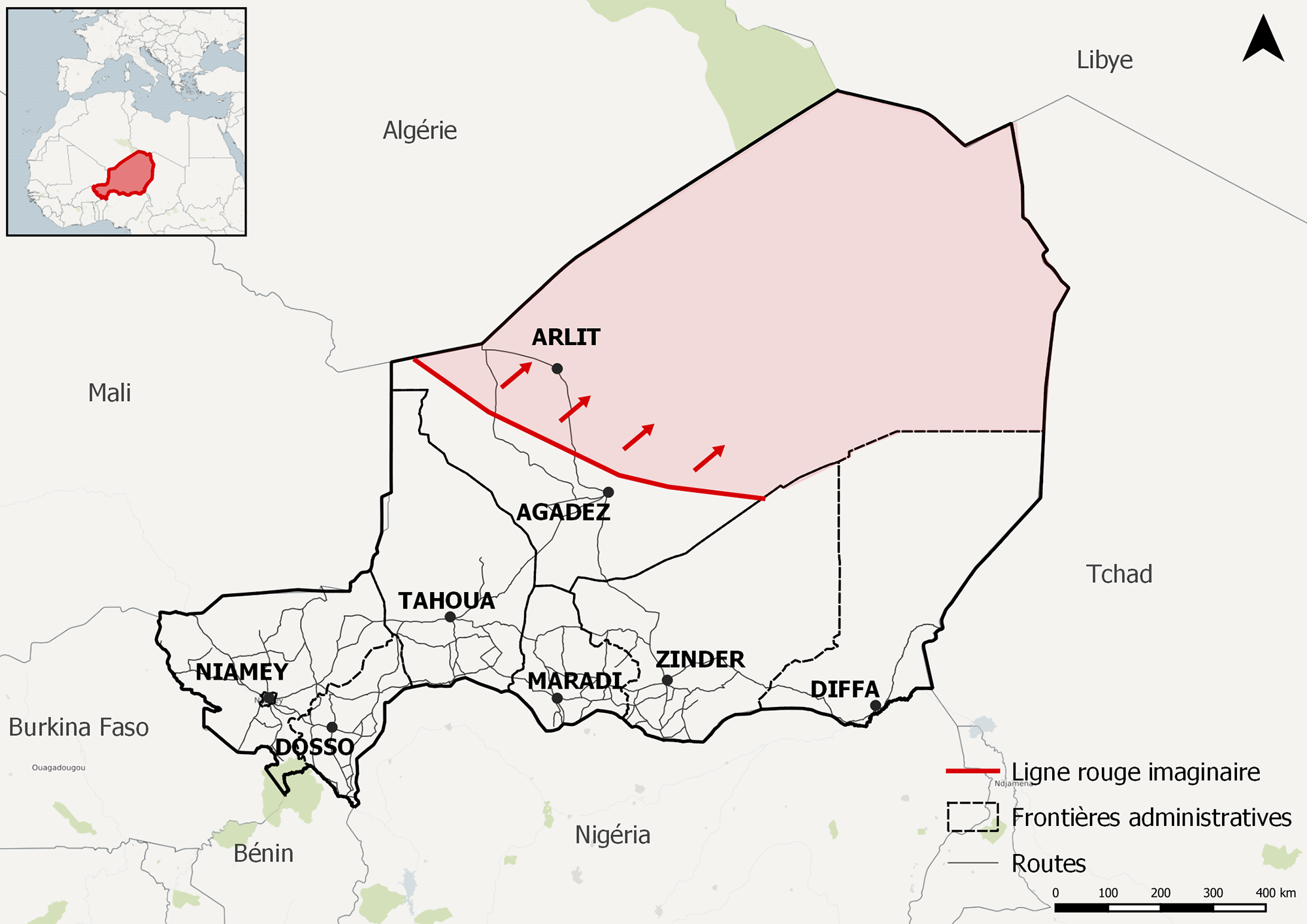 The 2015 law is being implemented first in the Agadez region, before its application is extended to the rest of the country. In this northern region, an imaginary line seems to divide the country in two, although it is not recognized at the highest level: on the one hand, in the south, an authorized but controlled area of movement for ECOWAS nationals and other foreigners with the required travel documents [8]; on the other side of this line, to the north, any foreigner is presumed to be going to Libya or Algeria, and his or her carrier will be prosecuted under the terms of article 10 of the anti-trafficking law, which provides for "illegal exit" from Niger.