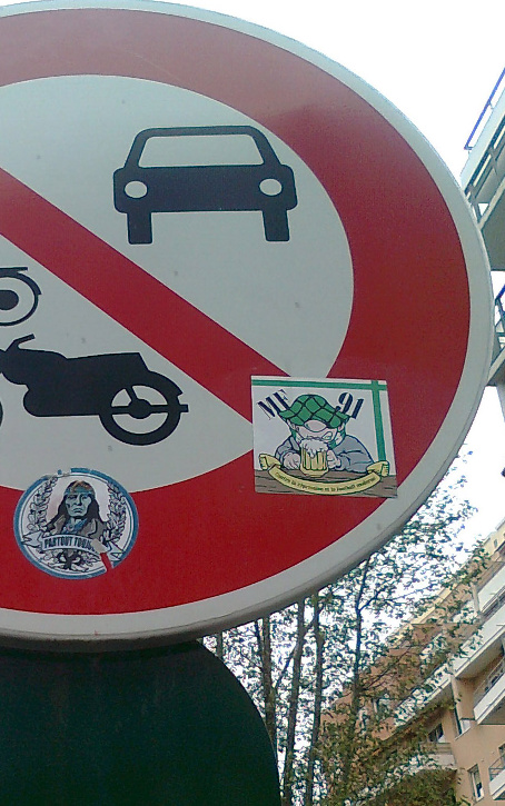 Accordingly, the frequent use of stickers symbolically contributes to maintaining competition between groups, which helps to build a symbolic arena of confrontation outside the stadium, in which ultras fans “eye each other up” from a safe distance and measure their respective dominance by signalling their presence in this way. This involves “fighting” each other with tags and stickers, removing those of “enemy” groups and sticking their own over them (denoted using the verbs sursticker, “to stick over”, and toyer, “to obscure by writing over” [10]). We see here a circulation of practices, associated with a specific vocabulary with links to the social worlds of tagging and graffiti on the one hand, and of ultras on the other. And, just like crews [11] of graffiti artists, ultras groups participate in a veritable “war of signs”, the aim of which is to pervade the public space while eradicating traces of other groups, so as to be more visible and symbolically gain the upper hand.
