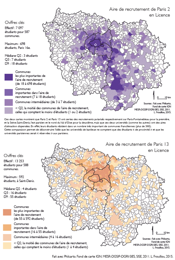 Cependant, ce constat global doit être nuancé. En effet, la figure 2 montre que, dans le détail, les aires de recrutement par université se caractérisent par une certaine dispersion : les étudiants de licence inscrits à Paris‑2 Panthéon–Assas et à Paris‑13 Villetaneuse sont répartis dans près de 590 communes franciliennes, sans compter les étudiants qui ne déclarent pas résider en Île-de-France au moment de leur inscription (respectivement 6 % pour Paris‑2 et 8 % pour Paris‑13 en licence). La concentration géographique des recrutements autour des sites universitaires est donc à relativiser. En outre, toutes les universités franciliennes sont implantées dans plusieurs sites, selon les cycles d’études et les disciplines : la carte de l’aire de recrutement de Paris‑2 Panthéon–Assas montre bien son double ancrage à Paris (site principal) et à Melun (site secondaire). La relative dispersion des recrutements universitaires franciliens ne découle pas seulement de ces multiples sites de formation : une analyse limitée à une formation et à un cycle d’études confirme qu’un nombre important d’étudiants ne s’inscrit pas dans l’université la plus proche de leur domicile. Autrement dit, la ségrégation universitaire, tout comme la ségrégation scolaire, ne traduit qu’imparfaitement la ségrégation résidentielle. De façon générale, les ségrégations scolaires accentuent les différences sociales résidentielles (Duru-Bellat 2004), ce que confirment de récents travaux au niveau du collège en Île-de-France (Oberti et al. 2012).