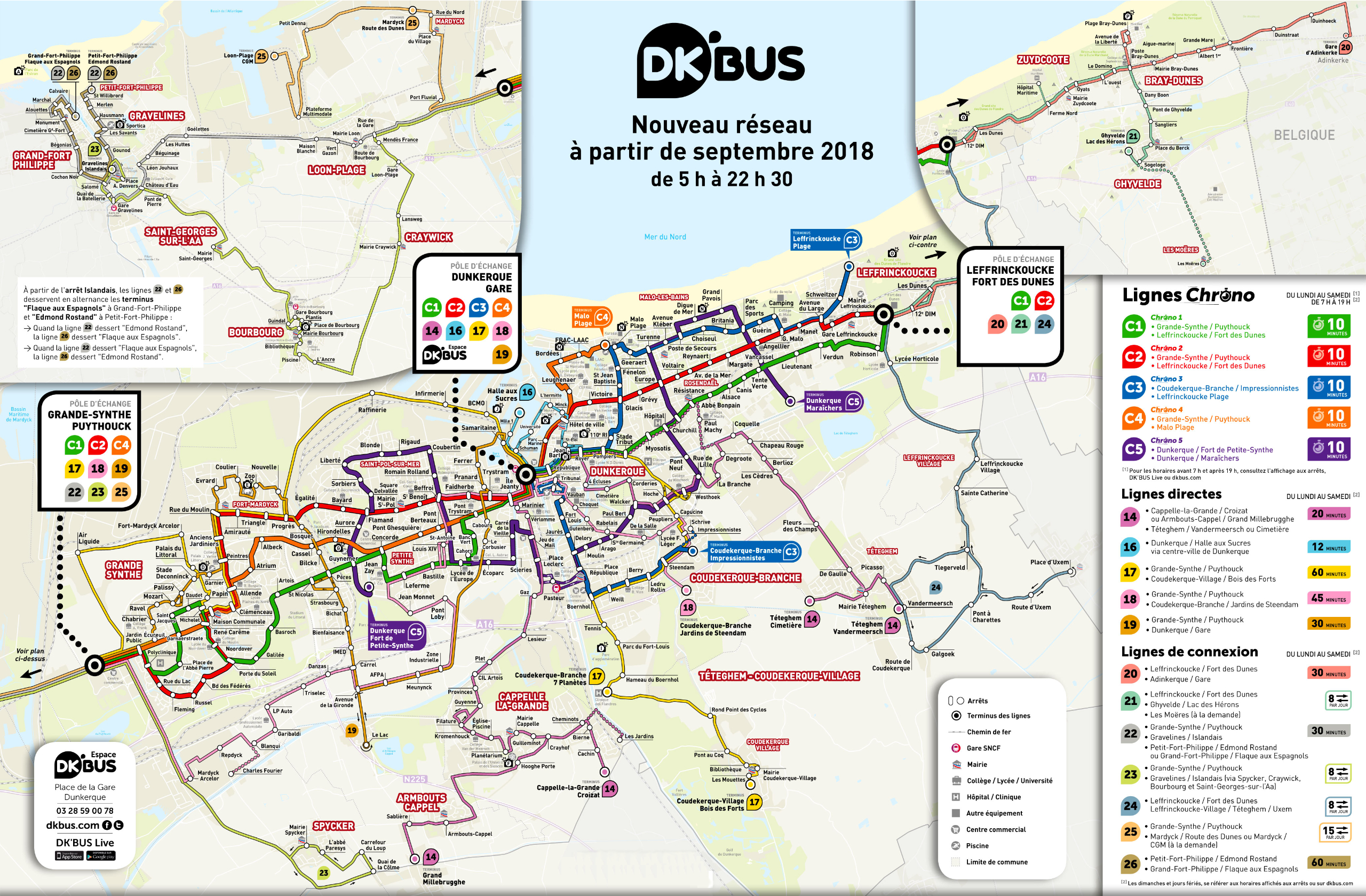 Free public transport – which has been in operation at weekends and on public holidays on an experimental basis since September 2015 in the 17 municipalities that make up the CUD – is set to become the norm seven days a week from September 2018. As a keynote measure in the manifesto of current mayor and CUD president Patrice Vergriete and his municipal team during the 2014 municipal election campaign, the promise of free buses across the urban area seeks to respond to a number of challenges that affect this industrial territory. For Vergriete, the primary aim was to boost the purchasing power of residents in an area affected by a slow and painful transition towards the post-industrial economy, [3] and where over a quarter of households do not have a car. This measure was also envisaged as a key lever for increasing the residential attractiveness of an area that, on average, has been losing 1,100 residents each year since 1999 (CUD 2013). Lastly, free public transport is one tool among others as part of a wider policy to improve the image of a declining urban core in the hope of stemming the demographic haemorrhage. The CUD is also working to completely overhaul its bus network, whose configuration dates from the late 1970s. Bus routes have remained practically unchanged since 1976, and today only a third of the CUD’s population is served by high-frequency bus services (i.e. with headways of 10 minutes or less). Two thirds of households therefore do not have access to a high-performance public transport system, including a large proportion of working-class residents, for whom running a car represents a very significant percentage of their household budget. The comprehensive plan for a bus rapid transit (BRT) system [4] – the “DK’Plus de Mobilité” plan – will come to fruition in 2018, and will offer a new and entirely free public transport network to residents of greater Dunkirk. Five key lines [5] with a high level of service, and benefiting from numerous dedicated rights of way, will structure this future network. These key lines will be complemented by around a dozen minor lines [6] (Figure 1).