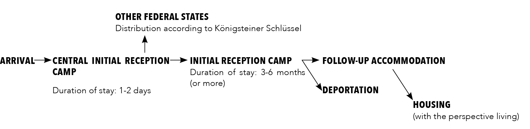 During our research, we observed that the locations of the camps also depend partly on the definition of “living” in German law. The law does not classify refugee accommodations as residences because refugees, with their inherent lack of self-determination, are not considered to be “living” there. Their status is temporary (see Dossmann et al. 2006, p. 60); consequently, camps cannot be built on plots designated for residential use. Furthermore, lawsuits brought by residents complicate the set-up of initial reception camps in more central and/or residential areas.