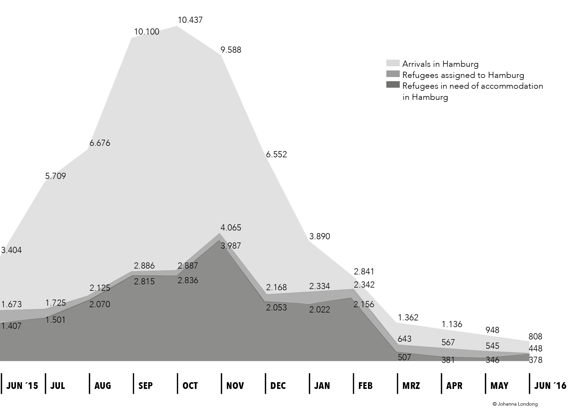 Germans have a constitutional duty to provide shelter to those looking for safety. Asylum seekers are distributed within the country in accordance with the Königsteiner Schlüssel law, which adjusts for tax income and the number of residents per region. This means that a densely populated city-state like Hamburg, with 1.7 million residents and a high tax income, is obliged to shelter more people than sparsely populated regions and/or regions with lower tax income (Asylgesetz 1992, §45). In 2015, Hamburg welcomed 2.5% of all arrivals to the country, corresponding to a total of 61,589 arrivals. Of these, 22,987 remained in the city (FHH 2016a). The rest were either sent to other federal states or were in transit to Scandinavia.