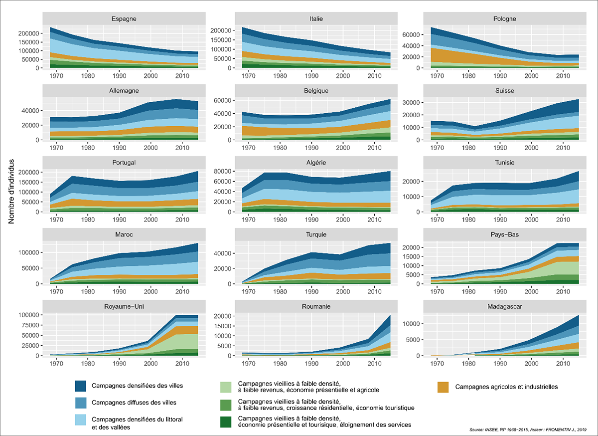 Tout d’abord, l’immigration actuelle repose en grande partie sur un héritage de vagues migratoires passées qui, si elles sont progressivement remplacées par d’autres, continuent de structurer le peuplement des campagnes. C’est le cas des anciennes immigrations qui diminuent de façon absolue et relative, mais restent pour certaines très importantes en valeur absolue (Espagne, Italie). D’autres groupes sont restés structurants (Portugal), ont acquis (Turquie, Pays-Bas, Royaume-Uni, Roumanie, Madagascar) ou retrouvé (Algérie, Tunisie, Suisse, Belgique, Allemagne) une importance récemment du fait de nouvelles migrations internes ou internationales, de sorte que la population immigrée des campagnes est aujourd’hui le résultat de ce mélange entre héritage de vagues anciennes et recompositions contemporaines des flux migratoires.
