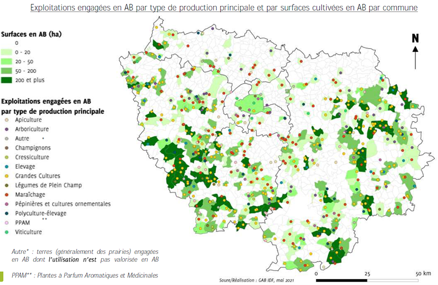 L’idée d’inscrire les systèmes de production dans une démarche de développement territorial privilégiant l’agriculture biologique se diffuse auprès des agriculteurs franciliens. En 2020, 33 103 ha sont cultivés en agriculture biologique, soit près de 5,8 % de la SAU régionale (GAB, 2021) contre 9,5 % à l’échelle nationale (mais seulement 2,5 % de la SAU en Hauts-de-France, autre région de grande culture, où cela représente toutefois 52 651 ha – GAB, 2020). Les exploitations en agriculture biologique représentent 11,8 % des exploitations franciliennes ; elles sont au nombre de 565, et 236 parmi elles sont en grandes cultures, soit 41,8 % des exploitations en agriculture biologique (GAB, 2021).