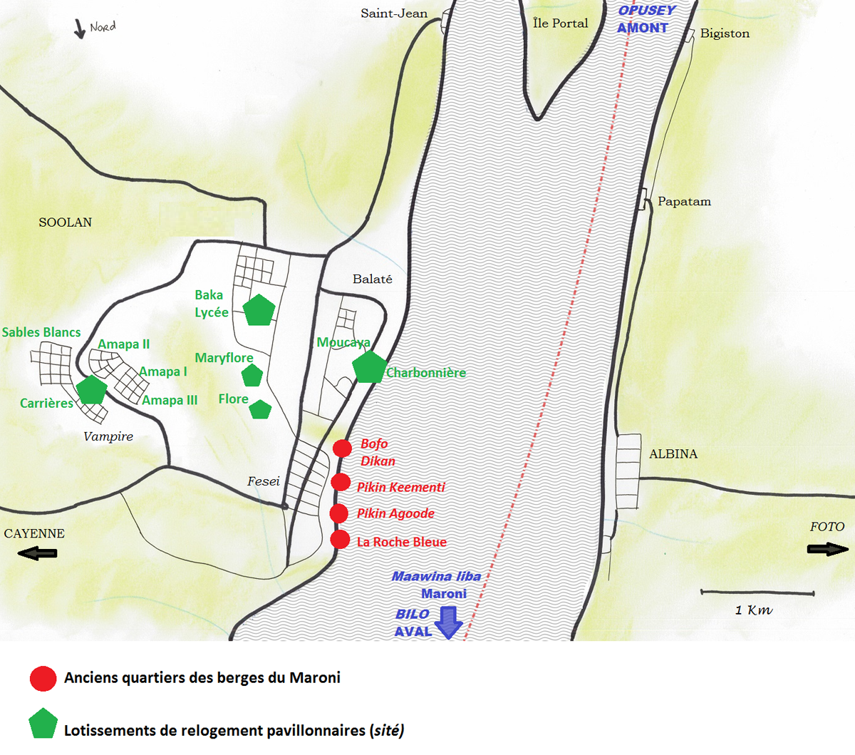 L’héritage colonial de ces politiques se donne à voir non seulement dans les marges de manœuvre importantes dont disposent les cadres bakaa pour mettre en place ces politiques, mais aussi dans la ségrégation ethno-raciale qui en découle. Ces lotissements, conçus pour un groupe de population particulier, ont abouti au déplacement des Bushinengué·es du centre-ville vers de nouveaux quartiers en périphérie. Ce déplacement ne s’est pas déroulé sans contestation : parmi les personnes qui avaient souhaité s’inscrire sur la liste des relogé·es, beaucoup ont apporté des modifications aux maisons de la Charbonnière. Par conséquent, les urbanistes ont ensuite réduit la dimension « adaptée » des nouveaux lotissements LES dits « sités ». Dans ces derniers, ne restait qu’une seule dimension spécifique aux populations bushinengués : la localisation périphérique. C’est ainsi que sont nés les principaux quartiers de Saint-Laurent, peuplé par les Bushinengué·es évincé·es des quartiers des berges du centre-ville par les politiques de démolition.