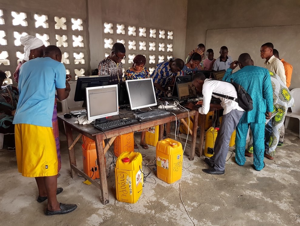 Trouver localement des produits neufs, de bonne qualité et à un prix abordable est une gageure. Le matériel informatique d’occasion est quant à lui importé d’Europe ou d’Amérique. Il s’agit souvent de machines en fin de vie qui terminent dans de grandes décharges à ciel ouvert, comme la tristement célèbre e-décharge de Agbogbloshie, à Accra, au Ghana. Pour construire leurs prototypes, la seule solution est la récupération de matériel et de pièces détachées. « Ici, quand on a un projet, on doit penser Récup’ d’abord », explique Ousia Assiongbon, cofondateur de l’EcoTecLab de Lomé. Au Bénin, le BloLab a lancé le projet RecycleBJ pour récupérer du matériel informatique usagé auprès d’entreprises, d’universités ou d’organisations internationales, pour alimenter leurs ateliers de construction de Jerry, ces ordinateurs construits à partir de composants recyclés assemblés dans un bidon plastique (jerrycan en anglais). Pour nombre d’écoliers et adultes, ces ateliers d’initiation permettent de toucher pour la première fois un clavier ou une souris d’ordinateur et de démystifier une technologie lointaine. Ils offrent également la possibilité d’équiper en matériel informatique des établissements scolaires ou des associations de quartier qui n’en ont pas les moyens (Choplin et Lozivit 2019).