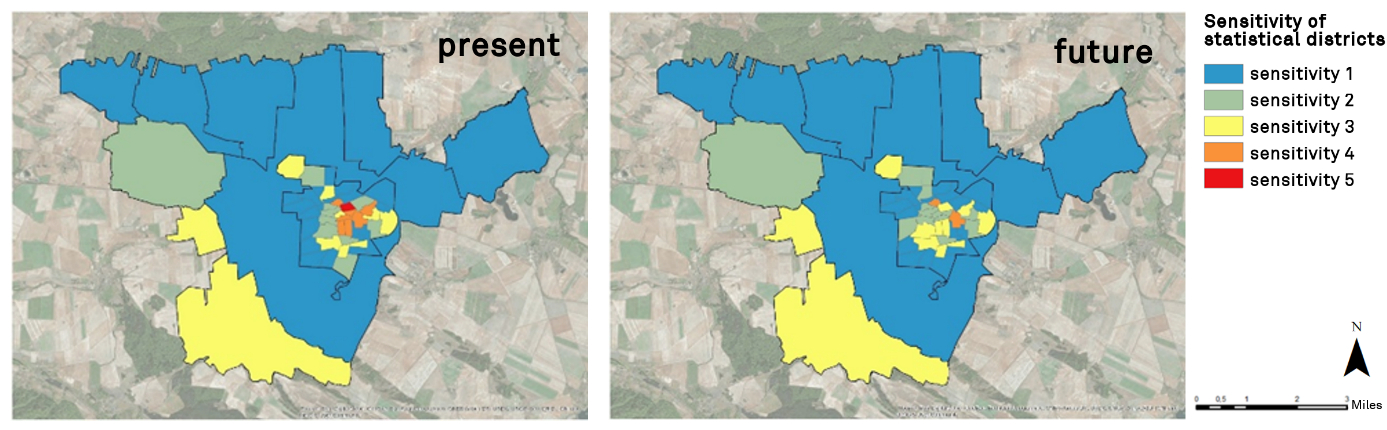 Climate projections indicate both an increase in dry days and an increase in heavy rainfall; given the rise in the temperature, scientists project more hot days and tropical nights. The dense building typology and large number of sealed parking lots, especially in the historic parts of the city, generate urban heat islands and floods downtown. As the most climatically exposed areas (Figure 4), the oldest parts of Halberstadt are also the most sensitive owing to both the dense building typology and the growing concentration of older adults (Figure 5). Facing the double urban challenge of climate change and demographic change, many German municipalities—supported by state programs—follow a combined strategy of upgrading the existing building stock and controlled settlement contraction in particularly affected or endangered areas. Accordingly, climate adaptation and demographic adaptation can potentially be linked by measures of managed retreat and urban restructuring. Conflicts are expected regarding the costs of the maintenance of underused infrastructure and a citywide barrier-free design that is more vulnerable (i.e. more likely to be affected by flash floods).