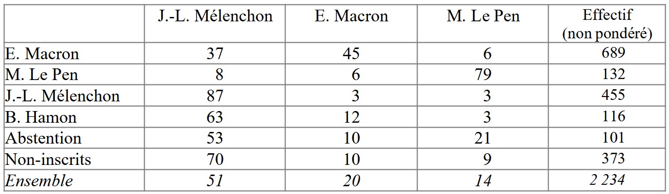 De même, la comparaison entre les votes au premier tour des présidentielles 2022 et 2017 (voir tableau 2) [8] montre que, si Jean-Luc Mélenchon retrouve la quasi-totalité (87 %) de ses électeurs de 2017, il parvient aussi à attirer la grande majorité des 17 % de votants de 2022 qui n’étaient pas inscrits ou n’avaient pas le droit de vote en 2017 (70 %) et des abstentionnistes de 2017 (53 %) qui se sont cette fois-ci rendus aux urnes. En d’autres termes, le succès de Jean-Luc Mélenchon en 2022 doit moins à des recompositions des préférences électorales qu’au maintien de « son électorat » et au renouvellement du corps électoral. Certes, Jean-Luc Mélenchon attire les suffrages de 63 % des électeurs de Benoît Hamon en 2017 qui ont fait le déplacement en 2022, mais ceux-ci ne pèsent que pour 5 % des votants de 2022. À l’inverse, Emmanuel Macron ne mobilise que très peu les néo-inscrits (10 %) ou les abstentionnistes de 2017 (10 %). De plus, alors qu’un gros tiers de ses électeurs de 2017 se sont tournés vers Jean-Luc Mélenchon en 2022 (37 %), il ne bénéficie que du report des voix d’une partie des électeurs de François Fillon en 2017.