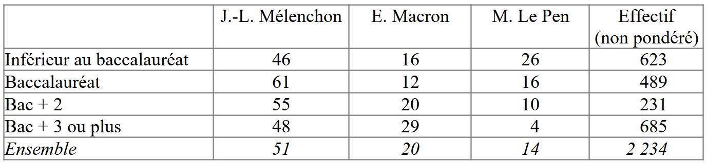 Source : Enquête sortie des urnes PEOPLE2022, Roubaix, premier tour. En tout, 76 répondants n’ont pas indiqué leur niveau de diplôme.