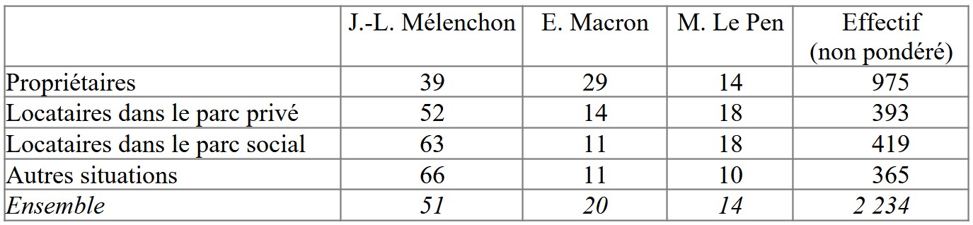 De la même manière, preuve de la persistance d’un effet « patrimoine » (Le Hay et Sineau 2010), les propriétaires, y compris à âge égal, sont significativement plus nombreux à avoir voté pour Emmanuel Macron (29 % contre 20 %) alors que les locataires du parc social ont davantage que les autres électeurs voté pour Jean-Luc Mélenchon (63 % contre 51 % de l’ensemble des répondants). À l’inverse, concernant Marine Le Pen, les différences sont très réduites, voire inexistantes, entre locataires dans le parc social et dans le parc privé.