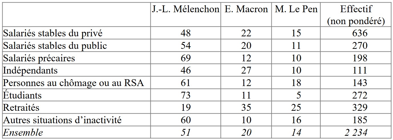 Source : Enquête sortie des urnes PEOPLE2022, Roubaix, premier tour. En tout, 90 répondants n’ont pas indiqué leur statut professionnel.
