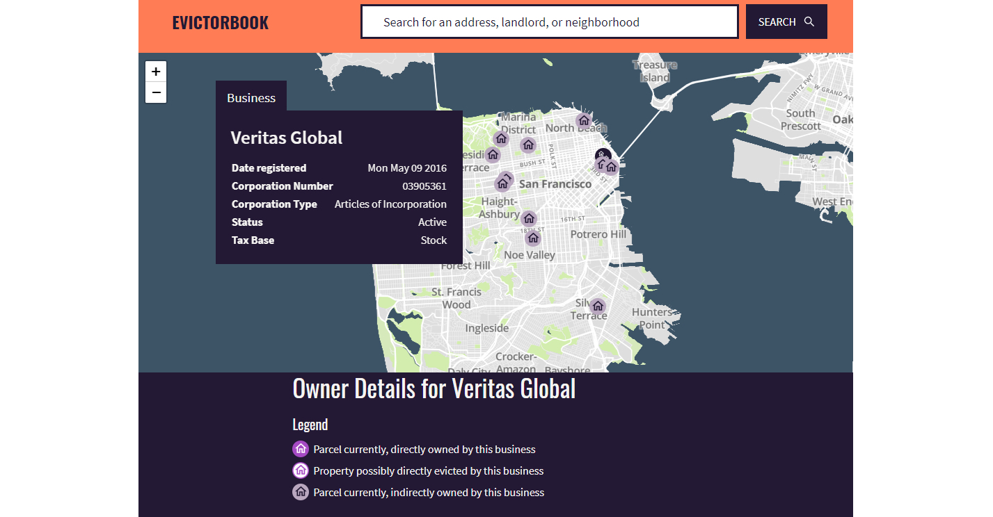 We have also collaborated with organizations we consider leaders in the intersecting space of data activism and housing justice. In the summer of 2019, we joined the efforts of the Anti-Eviction Mapping Project (AEMP) to develop a tool to facilitate landlord and building research in San Francisco (and soon Oakland). For years, tenant unions and organizers have scrutinized corporate-ownership documents, property records, assessor data, and eviction data to unmask speculators, serial evictors, greedy landlords, and their entangled networks of limited-liability companies (LLCs) and shell companies. Investment companies purchase properties using different LLCs for the purpose of anonymity and liability reduction. The corporate web guarding landlords can make ownership and property research challenging and slow.