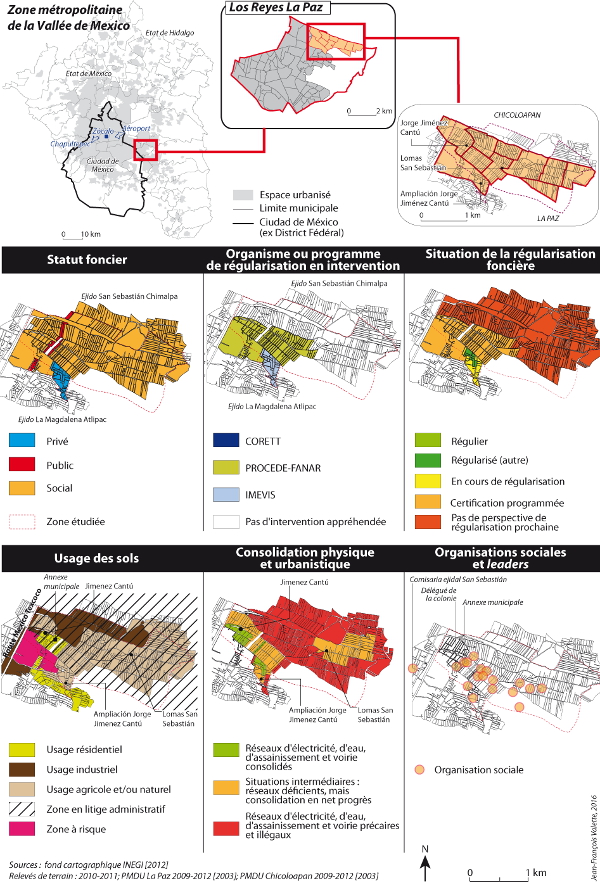 L’expansion de Mexico s’est réalisée en grande partie sur ces terres de propriété sociale, mais pas uniquement. Par exemple, dans l’est de la municipalité de La Paz, dans l’État de Mexico, les colonies Jorge Jiménez Cantú et Lomas de San Sebastián sont implantées sur des terres sociales, ejidales, alors qu’Ampliación Jorge Jiménez Cantú est en propriété privée (voir la carte ci-dessous). En 2015, ces colonies se trouvent toujours en situation d’irrégularité, à des degrés divers : la majorité des occupants ne disposent pas de titres de propriété, mais pour une partie des îlots l’usage du sol a été modifié en zone résidentielle – zonage qui réduit le risque d’éviction – et une école publique ainsi qu’une annexe municipale ont été construites. L’urbanisation illégale permise par la subdivision de terres collectives implique l’arrivée dans ces espaces de résidents qui ne sont pas les bénéficiaires de l’usage de la propriété sociale. Malgré l’illégalité de la subdivision comme de l’usage du sol, il existe un marché foncier, et en cela une circulation qui alimente le marché du logement.