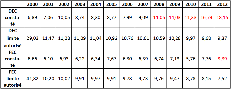 Légende (heures d’interruptions « tolérées » par trimestre) :