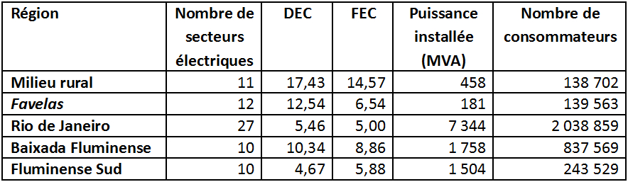 Le tableau ci-dessous montre le DEC et le FEC dans ces trois favelas (Chapéu Mangueira, Babilônia et Santa Marta) et le décalage avec celui de la zone de concession de la Light (global).