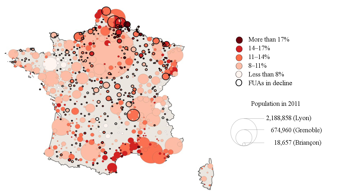Large FUAs are far less often subject to decline than their smaller counterparts; [6] indeed, over two thirds of shrinking FUAs are small; by comparison, small FUAs make up less than half of all growing or relatively stable FUAs (figure 3). This no doubt partly explains the difficulty involved in getting urban shrinkage on to the political agenda. On the one hand, the population residing in shrinking cities represents less than 10% of the whole urban population in mainland France and Corsica; on the other hand, these small FUAs seem to suffer from a lack of territorial integration. For while small FUAs, shrinking or otherwise, are – like all FUAs in mainland France and Corsica – well integrated into local urban systems (Berroir et al. 2017), they appear to be less well connected to the often multipolar networks that interlink these systems across the country. To put it another way, the decline of these small FUAs is linked more to their distance from FUAs and flows than to proximity to “monster cities” that swallow up wealth and the most highly qualified individuals.