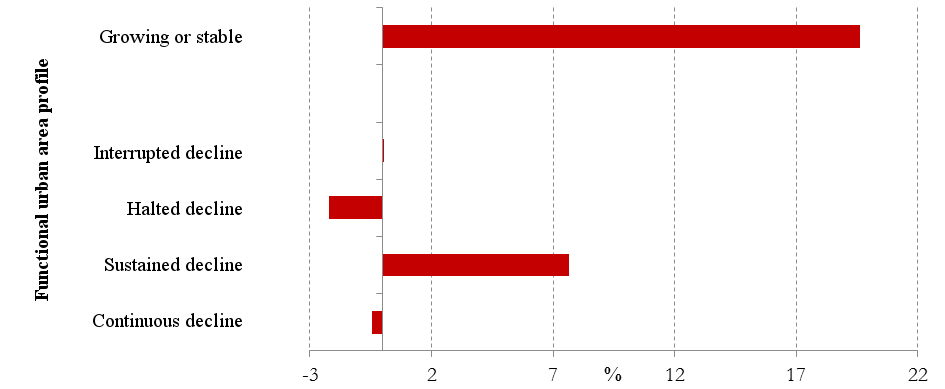 In growing FUAs, the economically active population aged 25 to 54 [7] – defined by the national census as people in work and unemployed individuals – increased by 16.8% between 1990 and 2011, whereas it fell over the same period by 3.3% in declining FUAs. If we consider only people in employment, the figures have also gone in different directions in different FUAs: it has increased by 15.9% in growing cities but dropped by 5.7% in those in decline. These decreases in the number of people in work are not, however, homogeneous among shrinking FUAs: they vary between -1.8%, for those in sustained decline, and -6% to -7%, for other areas. In both cases, the number of unemployed individuals has increased. As declining FUAs will have experienced both a drop in population and a rise in unemployment, they are typically characterized by higher proportions of unemployed people not just among the total population aged 25 to 54 but also among the economically active members of this age group (figure 4). The situation is particularly unfavourable for those FUAs that have been losing population since 1990 or 1999 (i.e. in continuous or sustained decline), with unemployment rates on average three percentage points higher than in growing cities. In the remaining declining FUAs (i.e. in halted or interrupted decline), population loss may have only occurred more recently, but the effects have been more intense (figure 5).