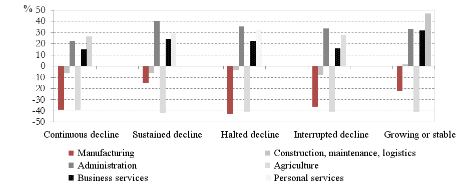 However, despite this slowdown in the industrial sector, the proportion of manufacturing jobs is still higher in these cities than in growing FUAs. For example, in cities with halted decline, the industrial sector still accounts for twice as many jobs as in growing FUAs (16.5% compared with 8.1%), despite a 43% reduction in the total number of manufacturing jobs in France between 1990 and 2011. Jobs in sectors such as construction and public works, transport, logistics, maintenance and repairs, and farming are also overrepresented, whereas sectors like distribution and services are less dynamic. Shrinking FUAs can therefore be characterized by the weakness of their presential economies – including activities such as domestic services and retail intended to meet local demand (Davezies 2009; Talandier 2013) [9] – which can be explained, among other reasons, by the greater difficulty involved in attracting those considered to be the drivers of this economy: tourists, retirees and students.