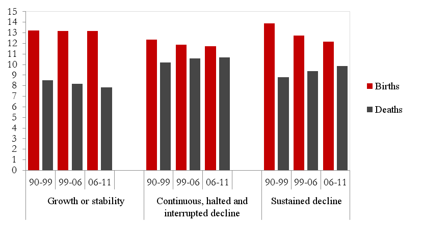 France’s fertility rate, among the highest in Europe (Mazuy et al. 2014), has until now made it possible to contain the phenomenon of urban shrinkage, owing to a positive rate of natural increase, but this specific form of “ageing from the middle” tends to cancel out the effects of this natural increase. This can be observed in all declining FUAs, but the speed of the process is particularly striking in FUAs in sustained decline (figure 9). In these areas, the rate of natural increase dropped from 5.1‰ in 1990 to 2.3‰ in 2011.