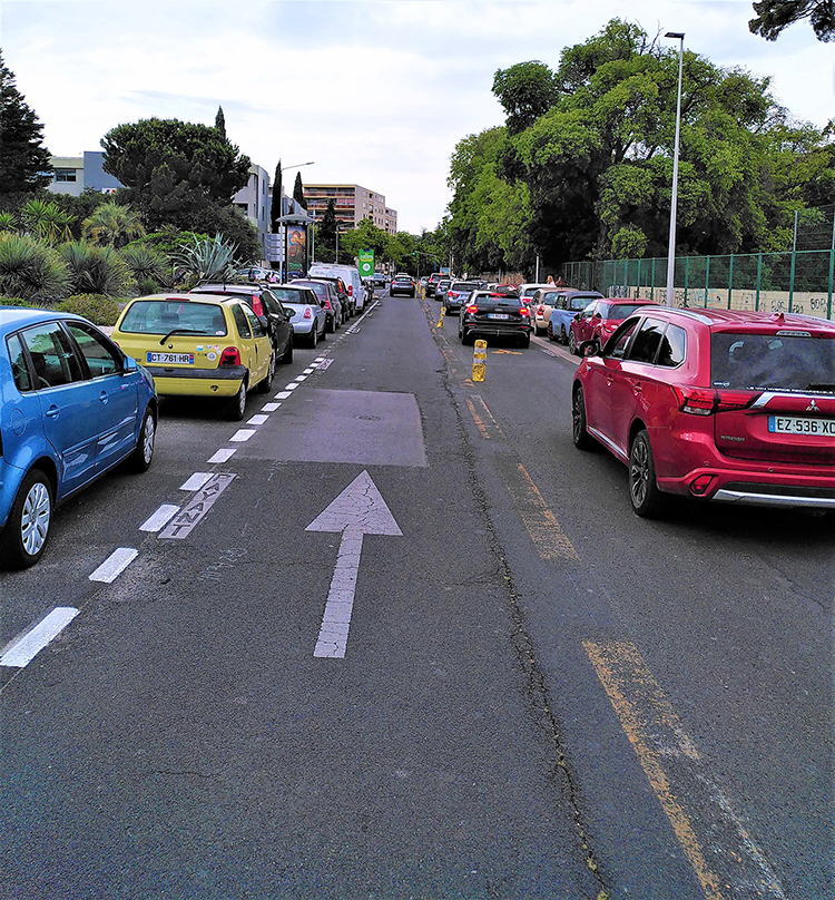 Due to a lack of suitable facilities, conflicts between cyclists and pedestrians persist. In Montpellier, on avenue de Nîmes, pedestrians and cyclists cross paths in a restricted space strewn with obstacles (curbs and bollards), due to the lack of a continuous and safe cycle route (Photo 12).