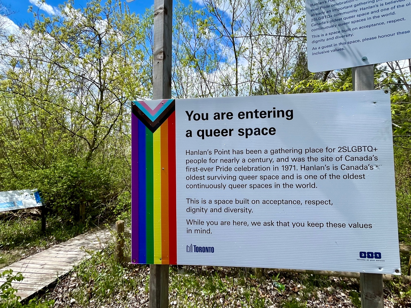 Since the construction of a breakwater during the expansion of Toronto’s harbor in the 1950s, erosion has been a problem at Hanlan’s. However, recent climate change-induced floods and storms have exacerbated the issue. A gradually disappearing beach, combined with an influx of non-queer beach users, has heightened the sense of urgency expressed by many campaigners. “The north end of the beach was straighter and the farther south you got, the queerer it got. But there was this slow encroachment […]. People were being pushed farther and farther south, but we ran out of beach, it was getting washed away,” one activist commented in an interview. Reflecting on this combined threat, one of the co‑founders of Friends of Hanlan’s emphasized, “in order to protect Hanlan’s, we had to work on ways to beef up the ecology and make sure that people are making a more intentional choice to visit.” Sidestepping the planning process, the campaign worked with the city councillor representing Toronto Islands on two successful motions to recognize Hanlan’s as a historically queer space, install cultural markers and signage, replenish eroded sections, and expand the “clothing optional” designation to the entire beach.